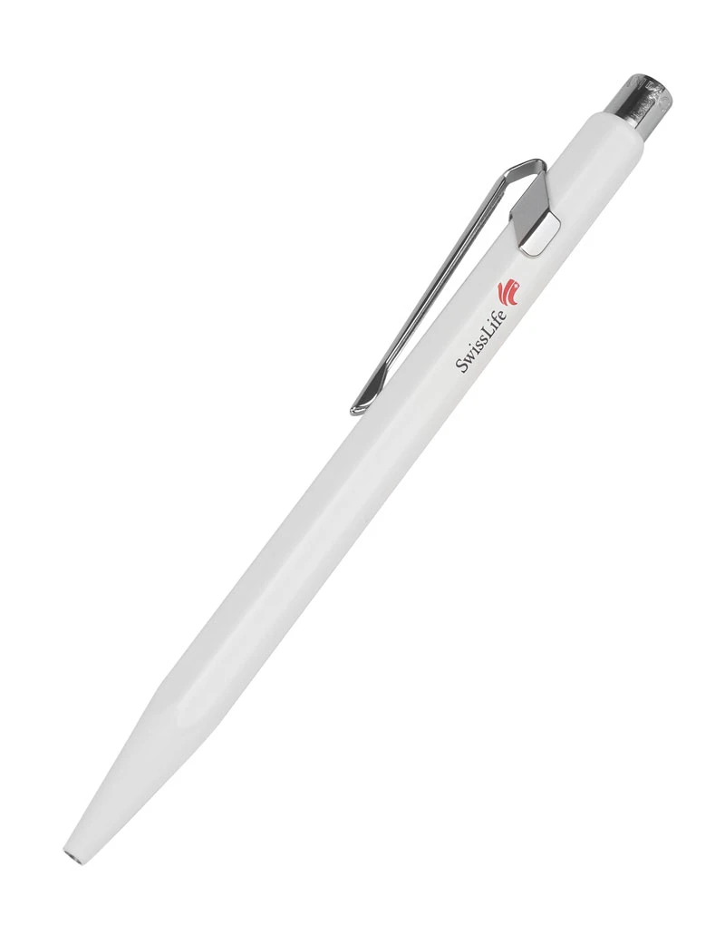Der klassische, sechseckige Kugelschreiber von Caran d’Ache aus Leichtmetall in Weiss, bedruckt mit dem Swiss Life-Logo. Verpackt in schöner weisser Alu-Schachtel.